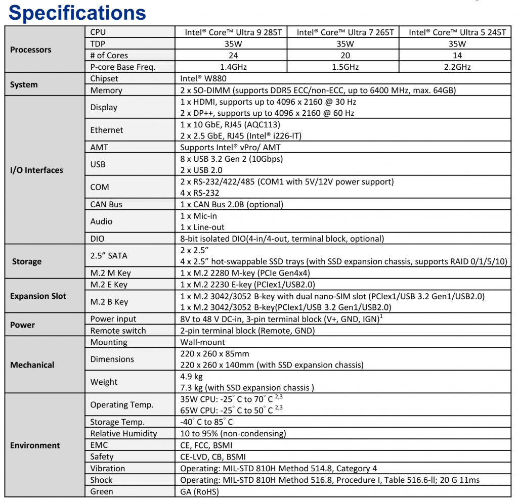 Half-rack and rugged fanless edge computer, supporting Intel® Core™ Ultra 200S series CPU with Intel W880 chipset and up to six 2.5-inch SSD, RAID 0/1/5/10 and rich I/O
