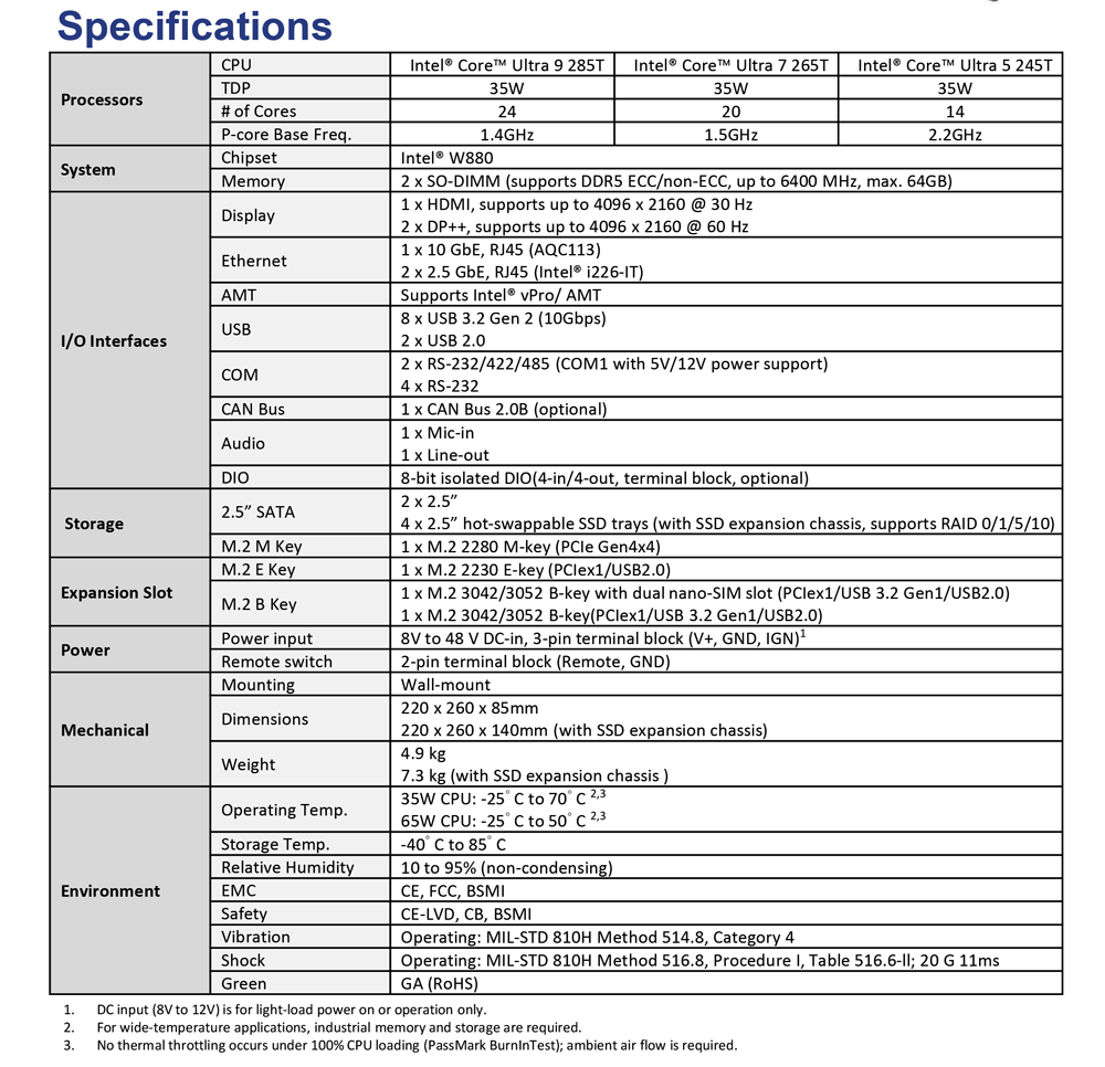 • High-performance processing: Powered by Intel® Core™ Ultra 200S series CPU with W880 chipset for demanding edge applications.